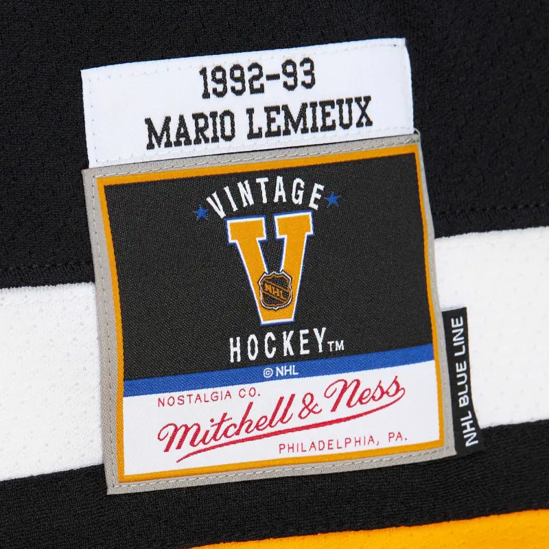 • You can feel like you're hitting the ice with the greats by putting on this Mario Lemieux Pittsburgh Penguins 1992/93 Blue Line Player Jersey from Mitchell & Ness. This jersey features authentic Pittsburgh Penguins colors and graphics, exactly like what Mario Lemieux wore during his time with the team.
