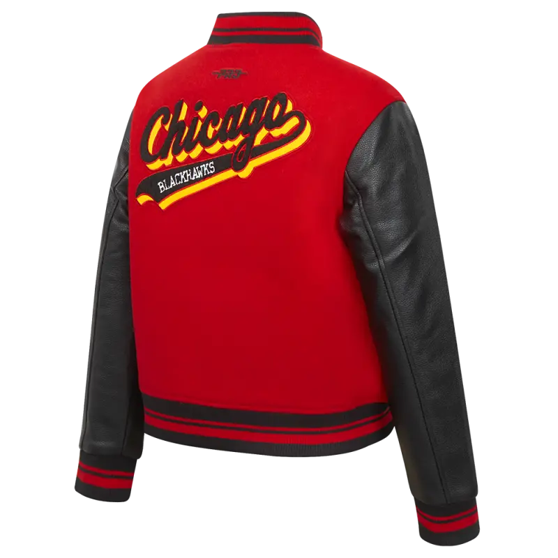 NHL CHICAGO BLACKHAWKS SCRIPT TAIL WOMEN’S WOOL VARSITY JACKET (RED\/BLACK)