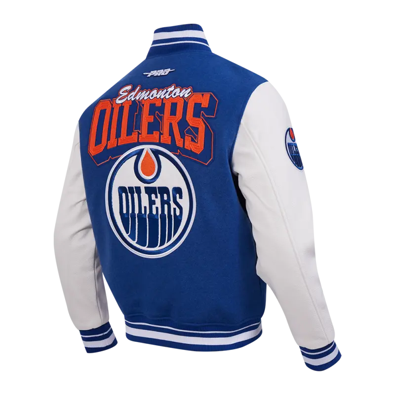 NHL EDMONTON OILERS TEAM BADGE MEN’S RIB WOOL VARSITY JACKET (DODGER BLUE\/WHITE)
