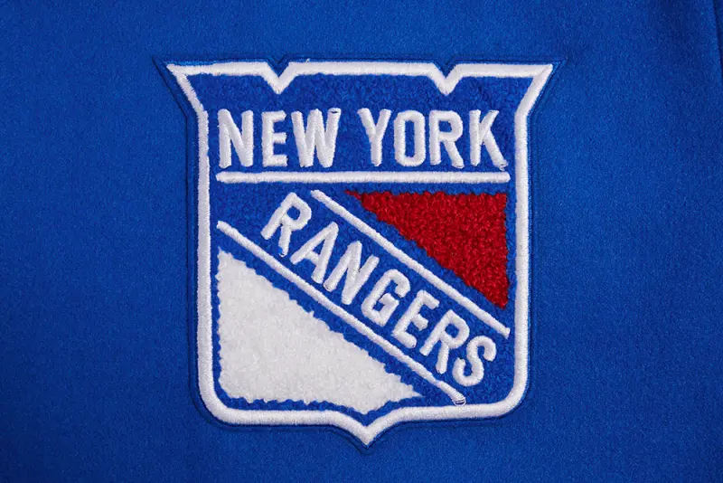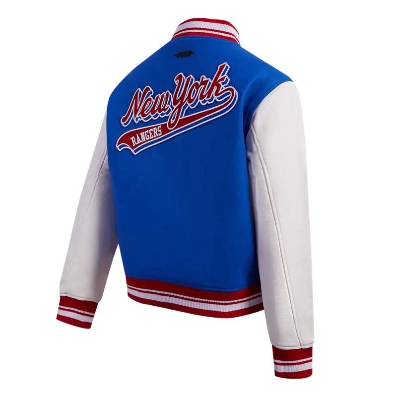 NHL NEW YORK RANGERS SCRIPT TAIL WOMEN’S WOOL VARSITY JACKET (ROYAL BLUE\/RED)